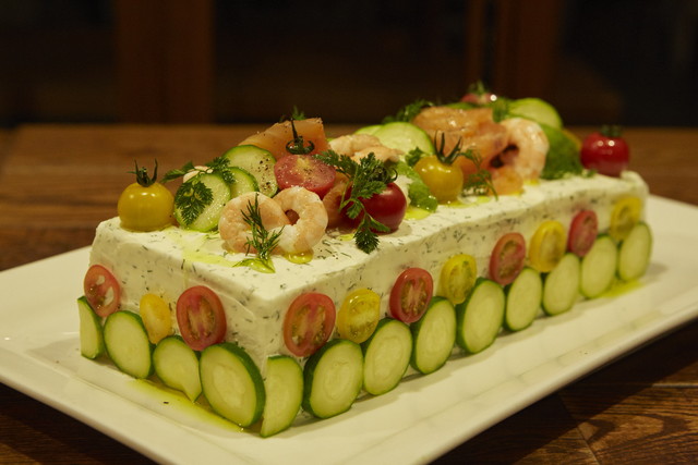 こちらは、スウェーデンではおなじみの“甘くないケーキ”スモーガストルタ。中身はサーモンとアボカド、ケーキのような見た目の“個性”を楽しむ一品です。