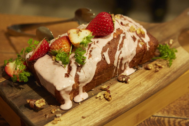 デザートは、いちごの“個性”を楽しむパウンドケーキ。一粒まるごと、カットされたもの、クリームになったもの……そして生地にもいちごが仕込まれているそう!