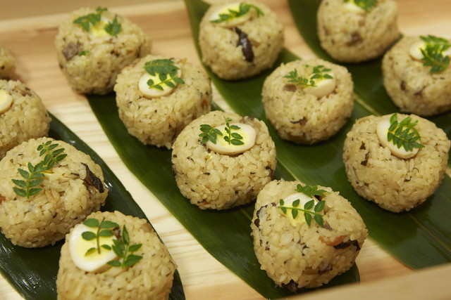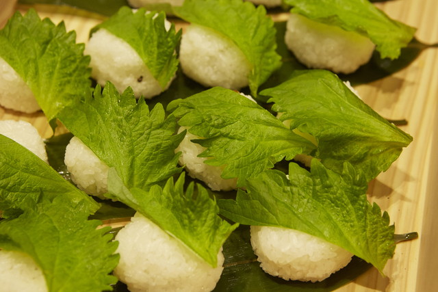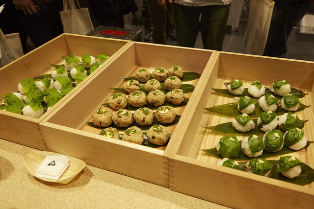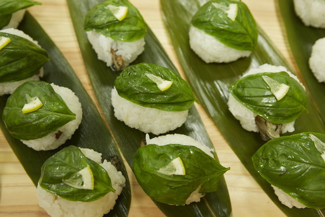 続いて、佐渡でとれた牡蠣の燻製のおむすび。上にバジルとレモンが添えられた、なんとも爽やかな一品です。