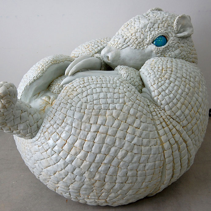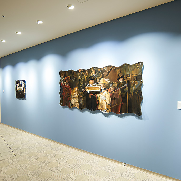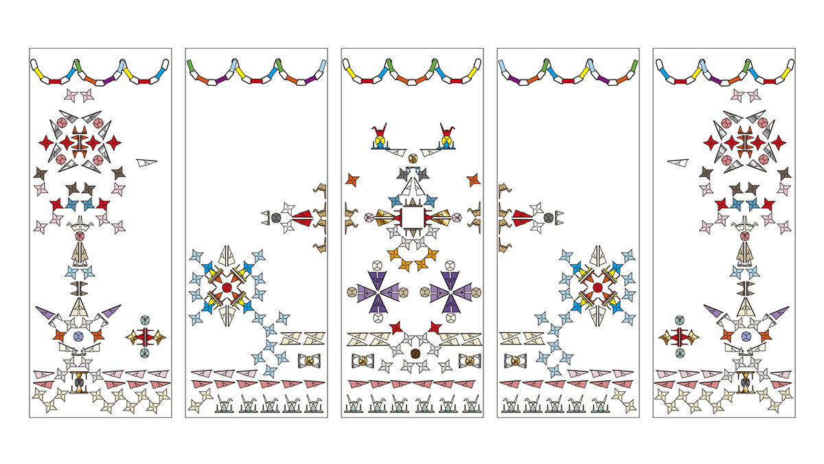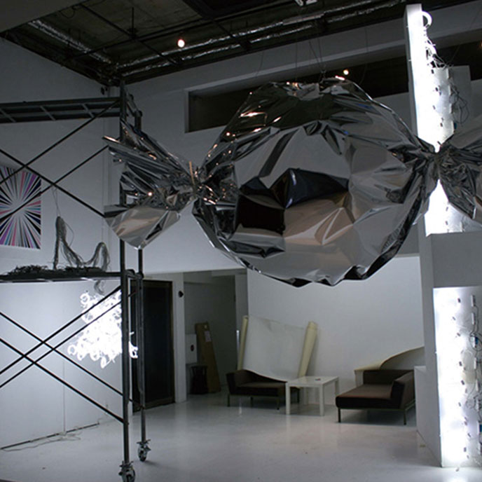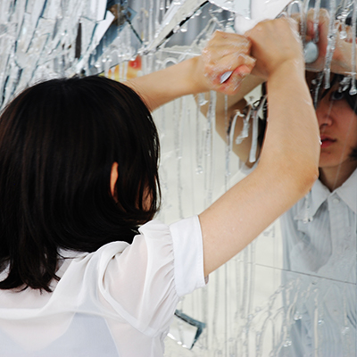 折り紙をモチーフにした立体作品を半分にカットし、鏡に貼り付けた作品です。紙から樹脂へ素材を変え、折り紙の左右対称という性質を活かした表現を展開します。