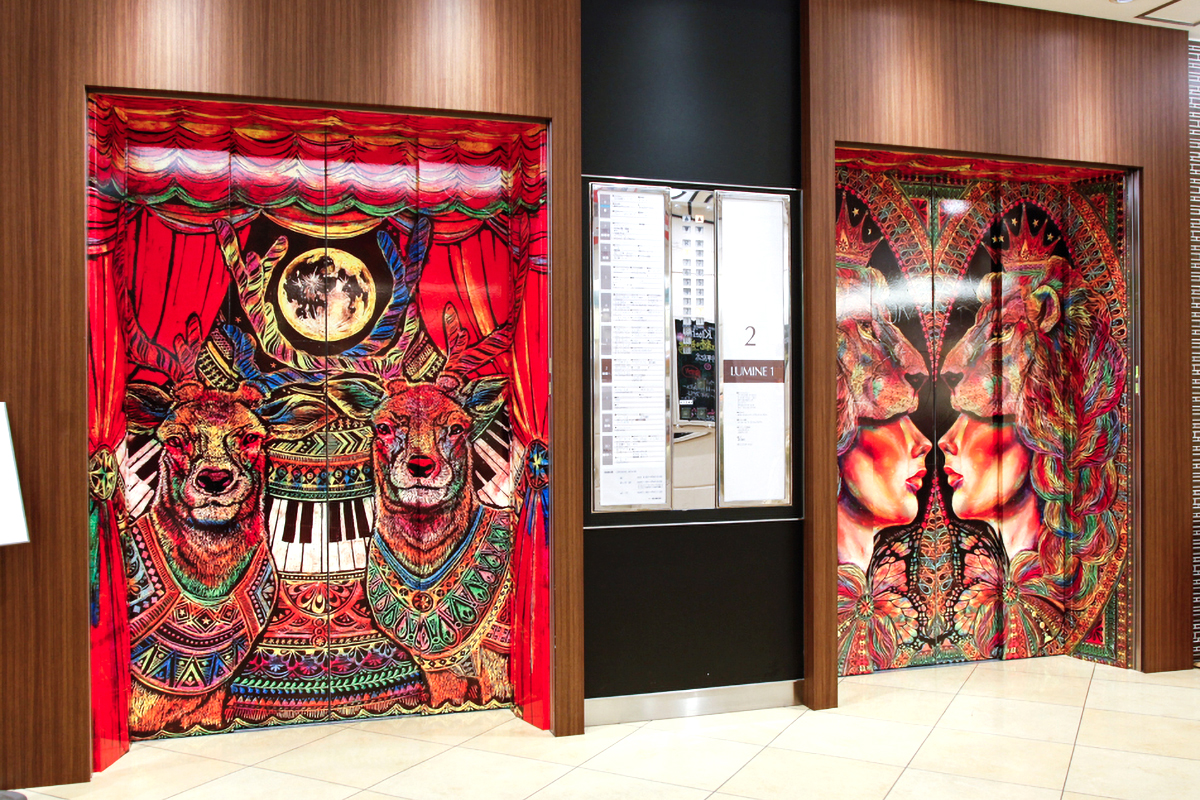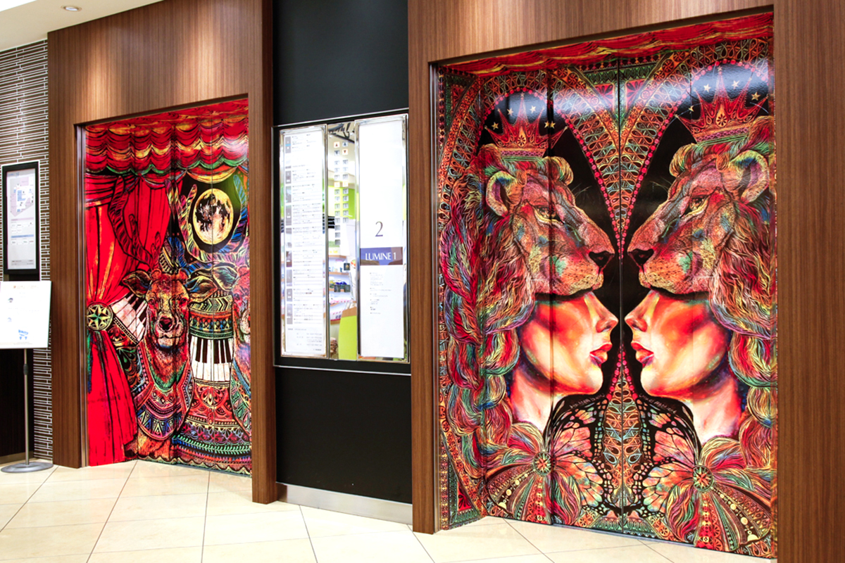 - 幕が開く瞬間のドキドキ感。サーカスと買い物、胸の高まる瞬間を重ね合わせたテーマがルミネ賞。どこか布を感じさせるイラストで、濃密な色合いはゴブラン織りしても素敵そうです。小さな空間をサーカス小屋に見立て、エレベーターに乗り込んだ人が、まるで別空間に迷い込んだかのような気持ちを誘う。日常の中の非日常を楽しめる装飾だと思いました。