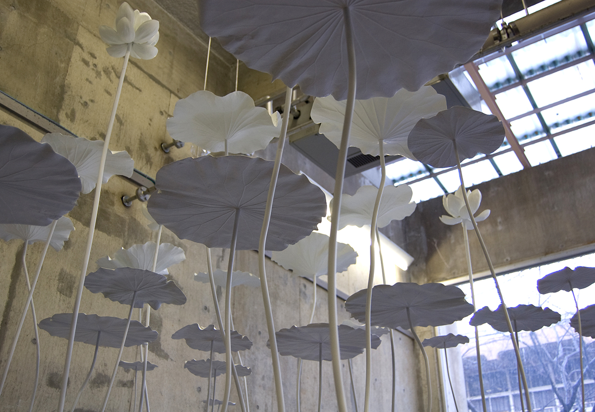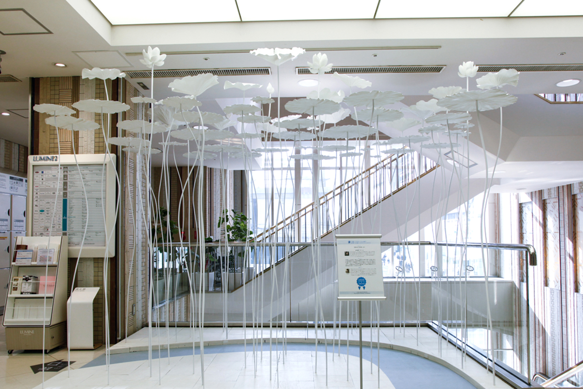 人々の頭上にハスの花が咲く、水面をつくる。鑑賞者はその水面の下を通ることが出来る。頭上のハスの世界は極楽浄土であり、その世界を鑑賞者は「見上げる」ことになる。それは今我々がいるのは「現世」である、という再認識を促す。ハスは水中の栄養をすって花を咲かせるが、極楽浄土という思想も「こうありたい」という現世の希望が造り出した世界であり、この花は水中では咲かすすべのない、人々の希望が生み出した花である。理想を夢見て、どんな状況でも希望を見い出し、今この世界で強く生きて欲しい、という思いをこめた作品。