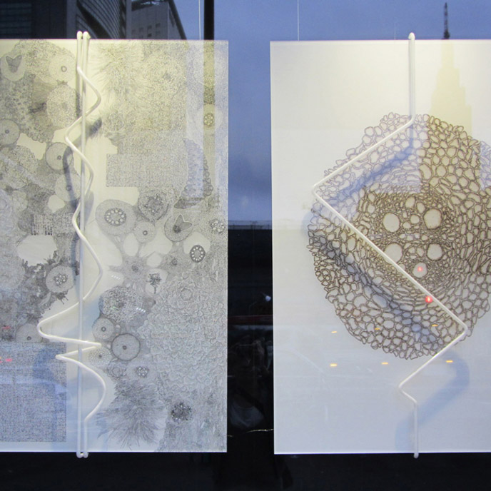 - 自分の「見えない」体内を表現したという西里さんの作品はザワザワするようで安らぎがあり、でも突然噴き出すような内なるパワーを感じます。無限にループする映像はポジティブな生命を感じます。慌ただしい喧騒の中ちょっと足を止めて観てください。そこには自分を見つめる瞬間が訪れると思います。