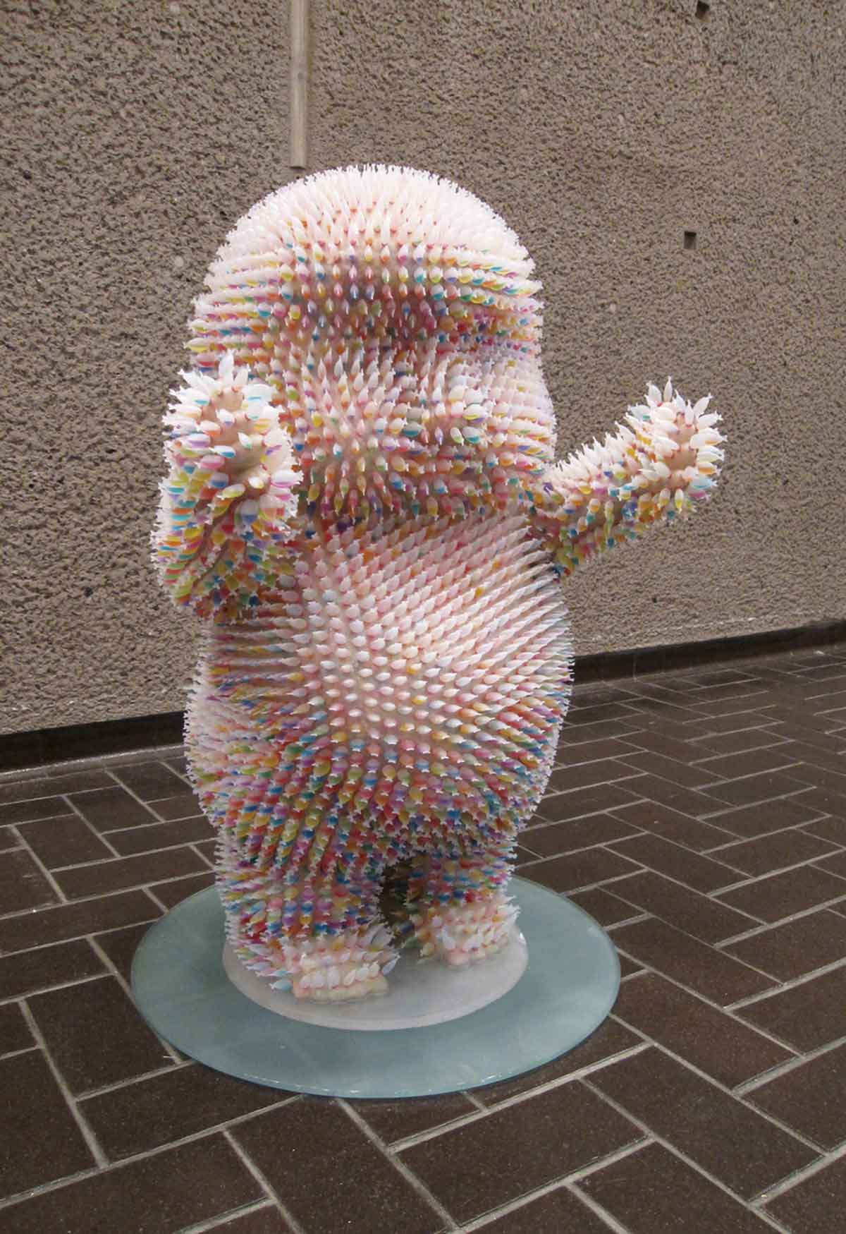 “Tokyo Baby” この作品は、表面についている醤油さしを観客が摘むことで、醤油さしの色水が子供の内側に染み込み、痕跡を残していきます。 しょうゆ差しが子供を取り巻く人やモノ、情報や影響を表しています。 “Tokyo Void” 都市や群集の中で埋没していく「個」の様子を表しています。 微視と巨視という捉え方によって変化する価値や存在に対する姿勢を、しょうゆ差しや中央の穴によって表しています。