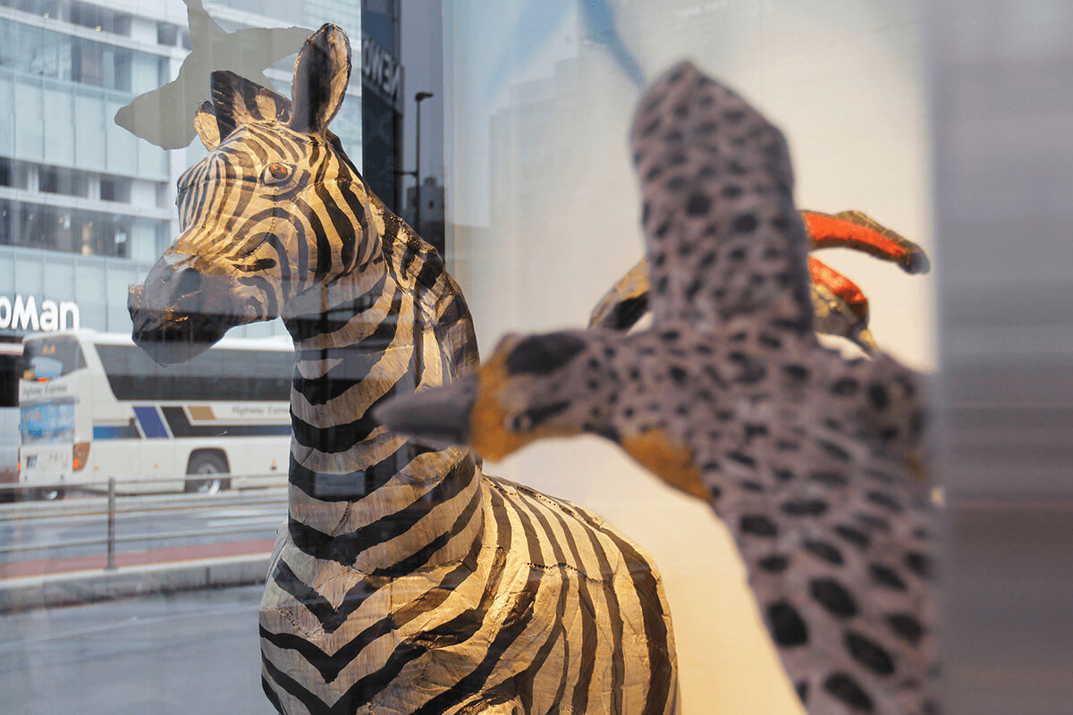 動物の形や色はとても魅力的です。もしすべて神様が作ったとしたならば「よく考えて工夫したものだ」と感心しますが、そうではなく、それらは動物達が、それぞれの生活している場所、暮らし方に合わせて何世代にもわたる遥かなる年月をかけて自ら作っていったものだと思います。僕は、そんな形や色に「なるほどなるほど」と思いながら、尊敬と憧れを持ってダンボールで動物達を作っています。今回は、サバンナの動物たちを新宿に登場させます。地球には、サバンナもあれば、新宿もあるところが「地球ってエライな!たいしたもんだ!」と思います。
