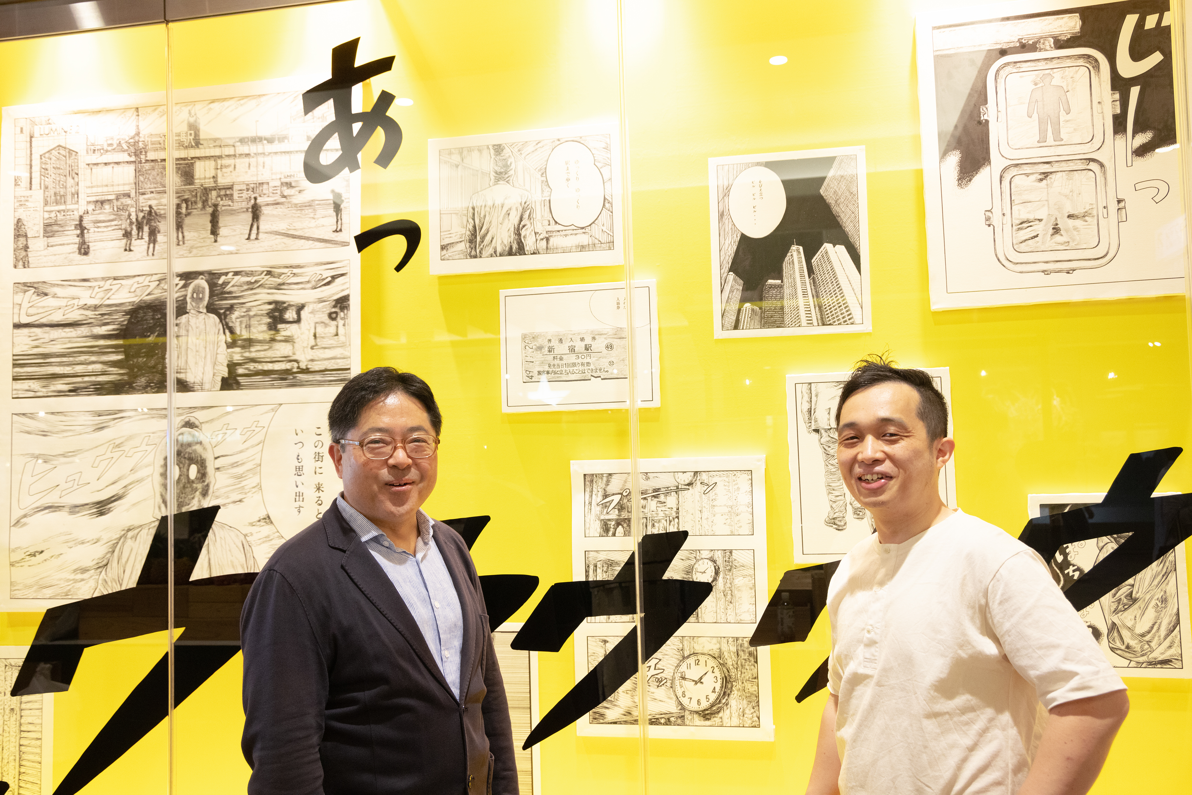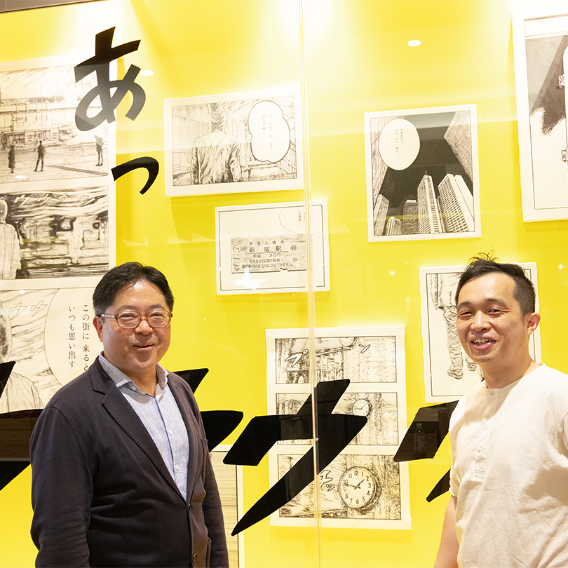 先日開催されたLMAAの10周年を記念したアーカイブ展では、ニュウマン新宿のウインドウでマンガ調の平面作品を披露。なぞの覆面の男が登場する点は2014年の受賞作品と重なるが、作風はまったく異なり、スケールもアップ。見る人がどんな年齢であっても作品の一部を切り取って「自分がもつ新宿のイメージ」と重ね合わせられるような仕掛けが、JR新宿駅横のショーウインドウという場にとてもマッチしていた。