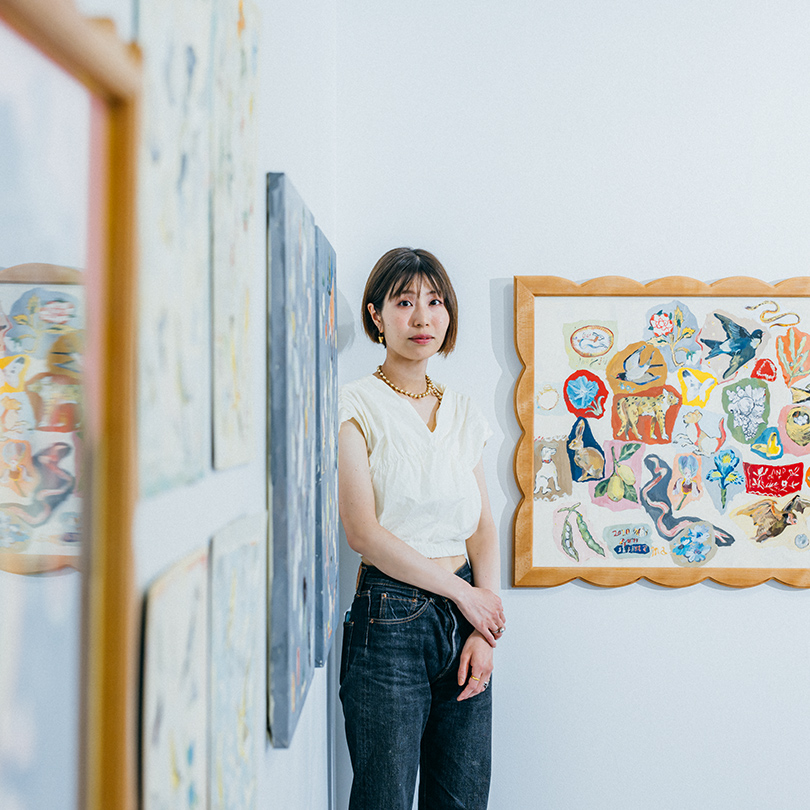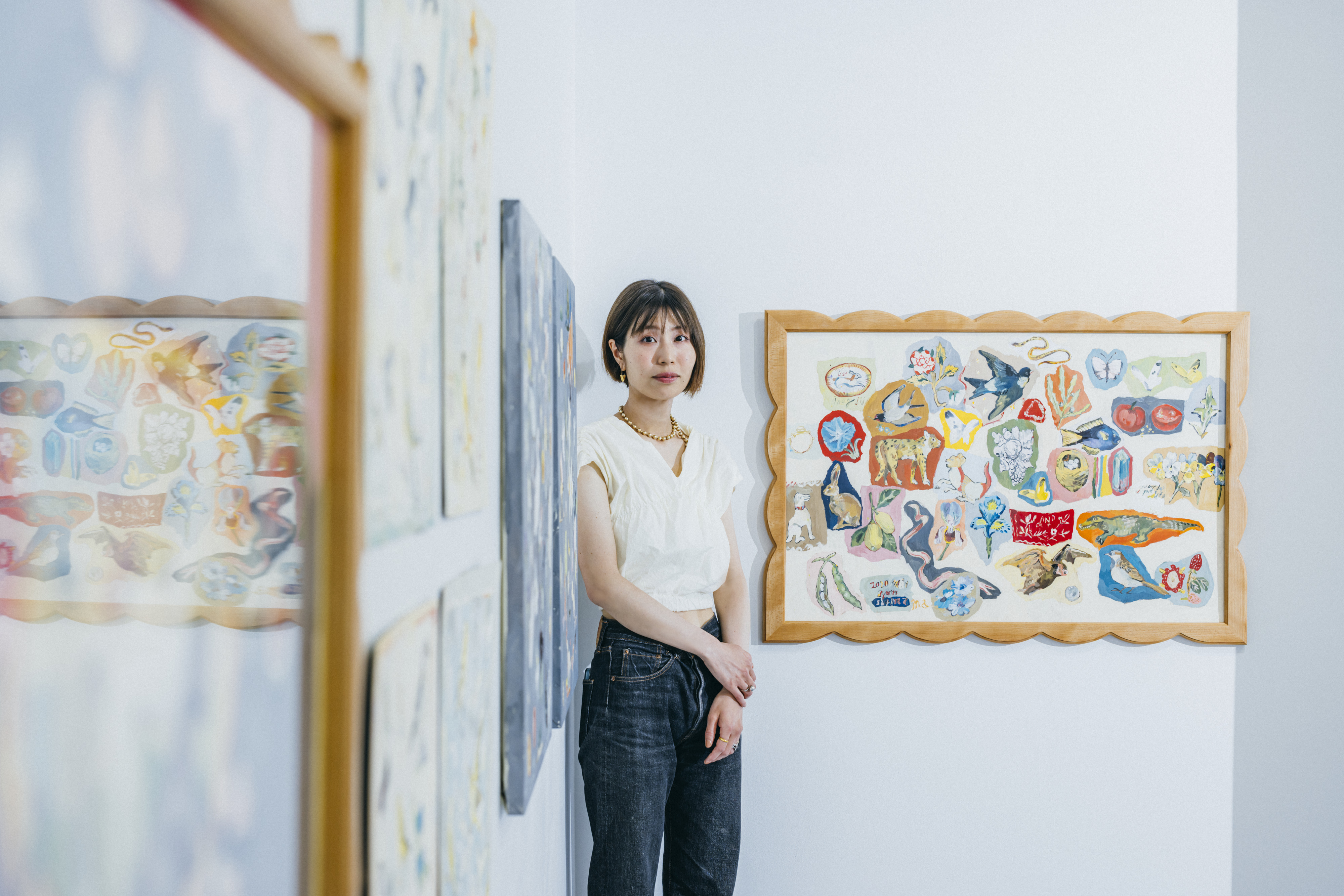 身近な動植物たちの気配や、ふとした表情。豊かな色彩で描かれたその世界にはほのかにファンタジックな雰囲気が漂い、イマジネーションが広がる。商業施設の館内装飾や商品パッケージのアートワークなども手がける庄島歩音さんが現在の作風に至ったのは、ロンドンの大学でファインアートを学んでいた頃のこと。
