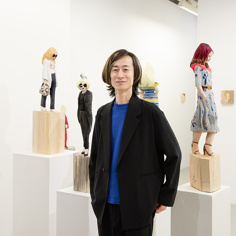 「消費社会に生きる女性たち」をテーマに、スタイリッシュなファッションに身を包んだ木彫りの女性像を制作する飯沼英樹さん。一本の木材から姿形を掘り出す「一木造り」の技法による作品たちは、どれも力強い表情を浮かべている。彼女たちがその目の奥にどんな感情を秘めているのか、あれこれ想像したくなってしまう。