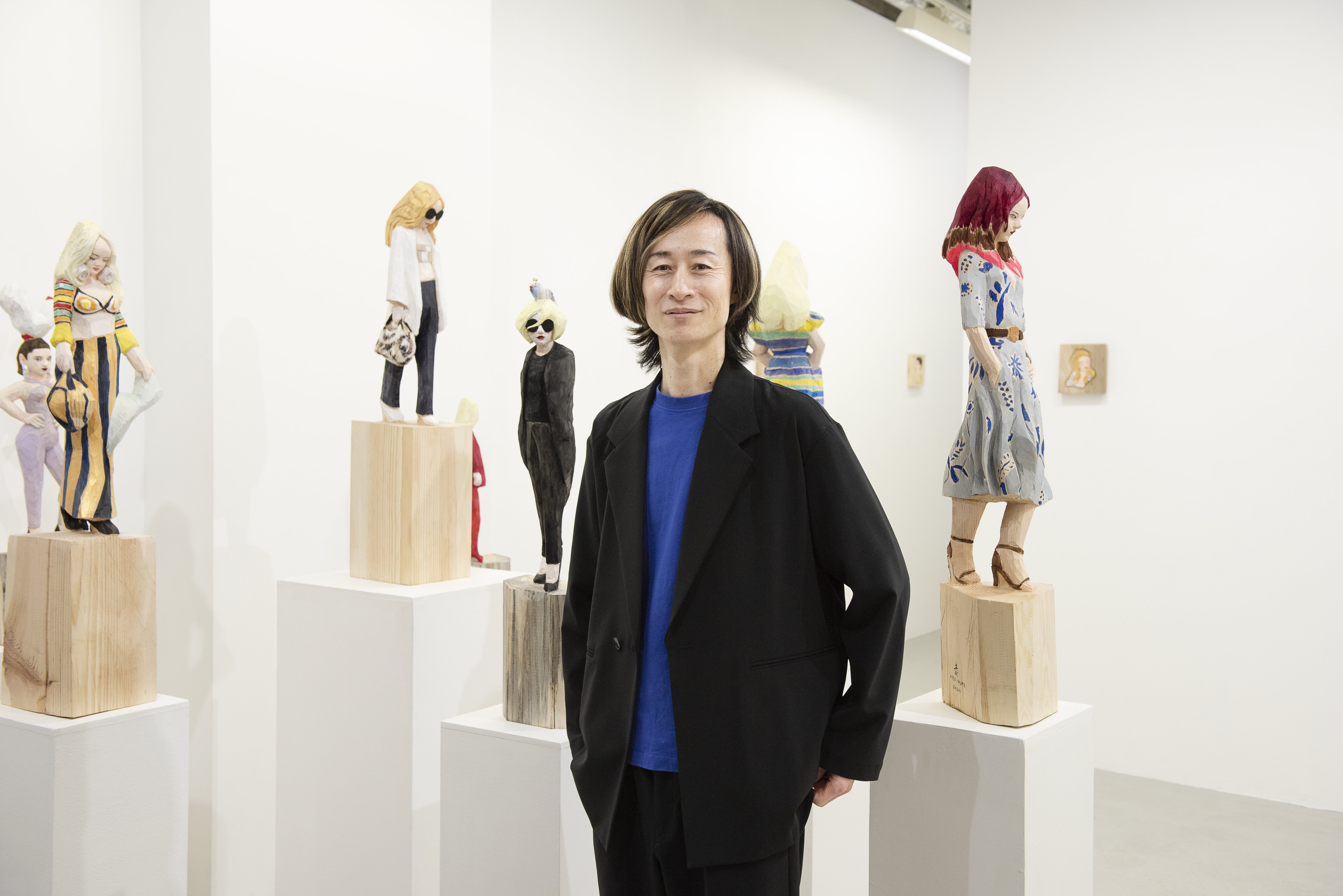 今年の春には、東京・南青山にリニューアルオープンした「アザワイズギャラリー」のこけら落としとなる個展を開催した。展覧会タイトルの「レクト/ヴェルソ」はフランス語で「裏表」を意味する。今回はランウェイやストリートからそのまま抜け出してきたような「一木造り」の立像に加え、平面を浮き立たせるように彫り込む「厚肉彫り」によるレリーフも新たに発表された。