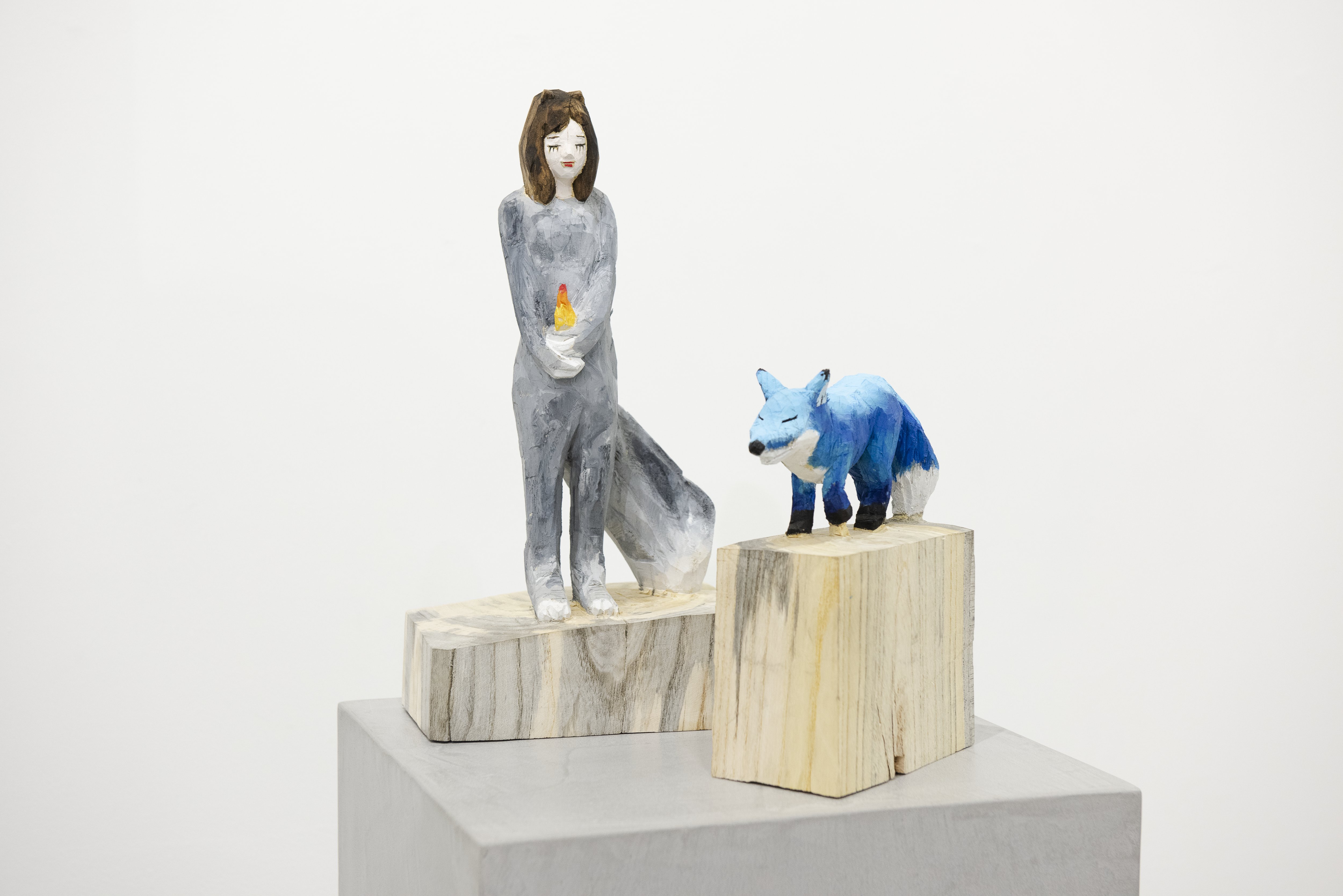「AAK」シリーズより。AAKとは「歩く青いキツネ」のこと。犬を散歩させる女性を着想源に、イメージは「女性と動物の関係」や童話「きつねのルナール」などへと広がり、明け方の空の色を思わせる青いキツネが誕生した。