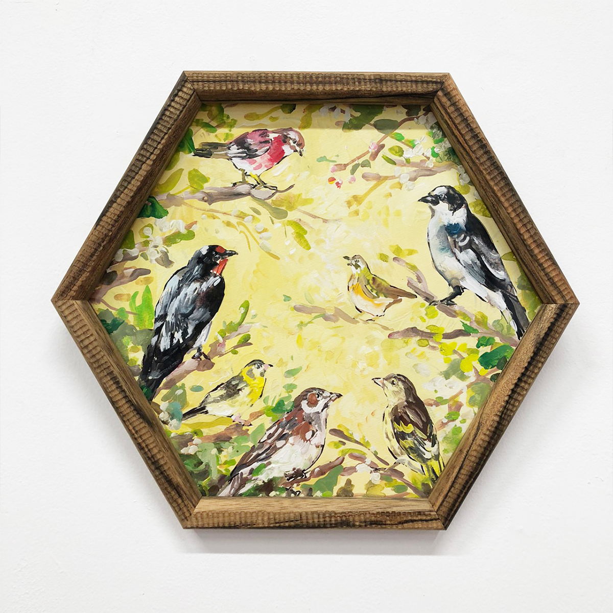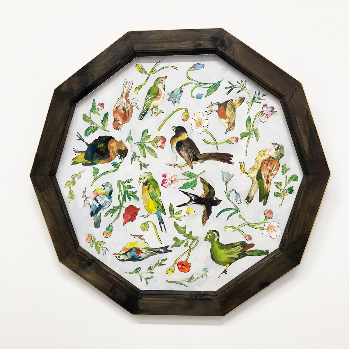 普段の生活の中では忘れがちな、身の周りに存在する自然の豊かさをテーマに動植物たちの日常の一瞬を重ね、下書きをせずに画面に溢れるばかりに描く。