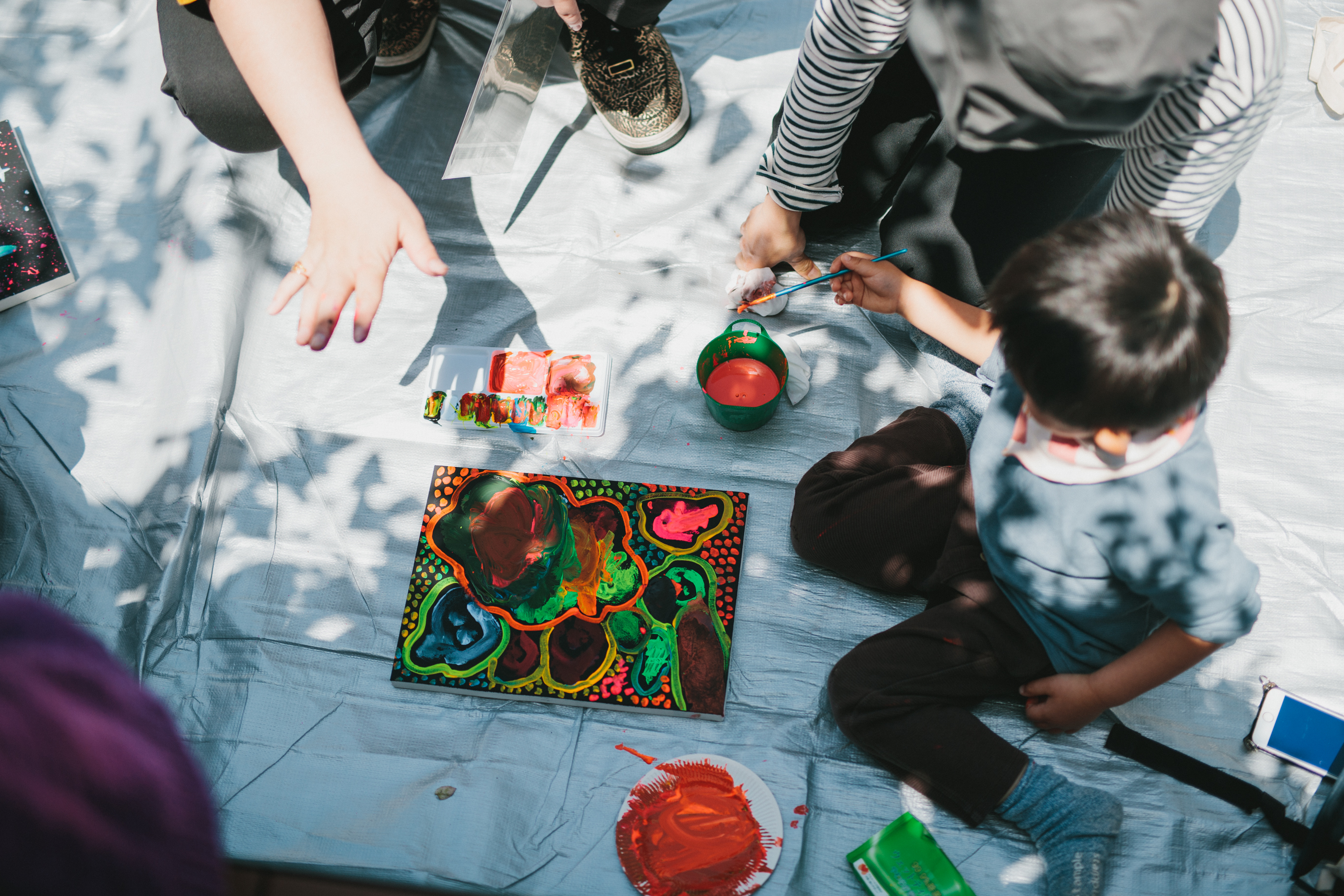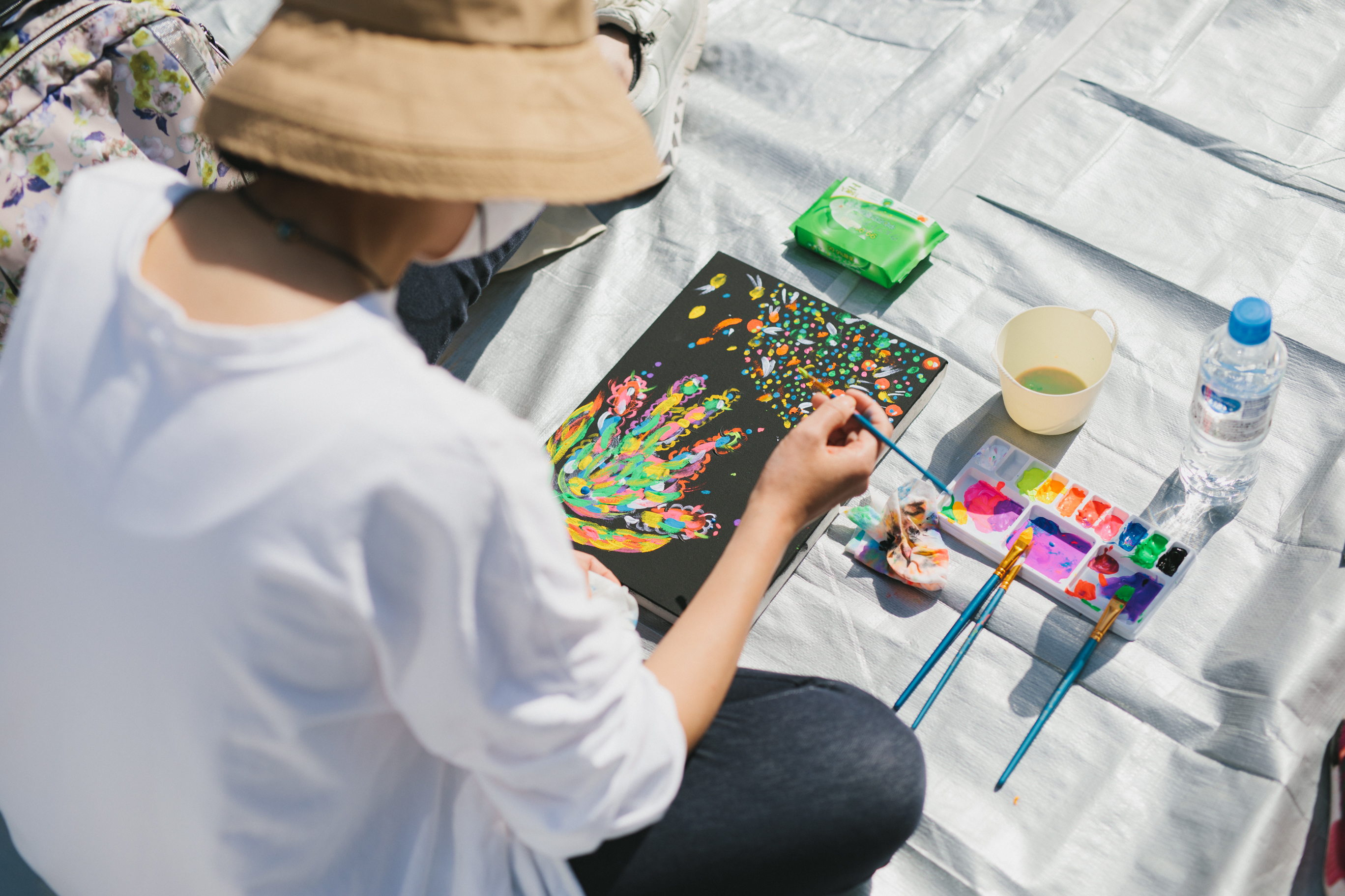 Suicaのペンギン広場にマットを敷き、初夏の風を感じながら青空の下でアートペインティングのワークショップを実施しました。