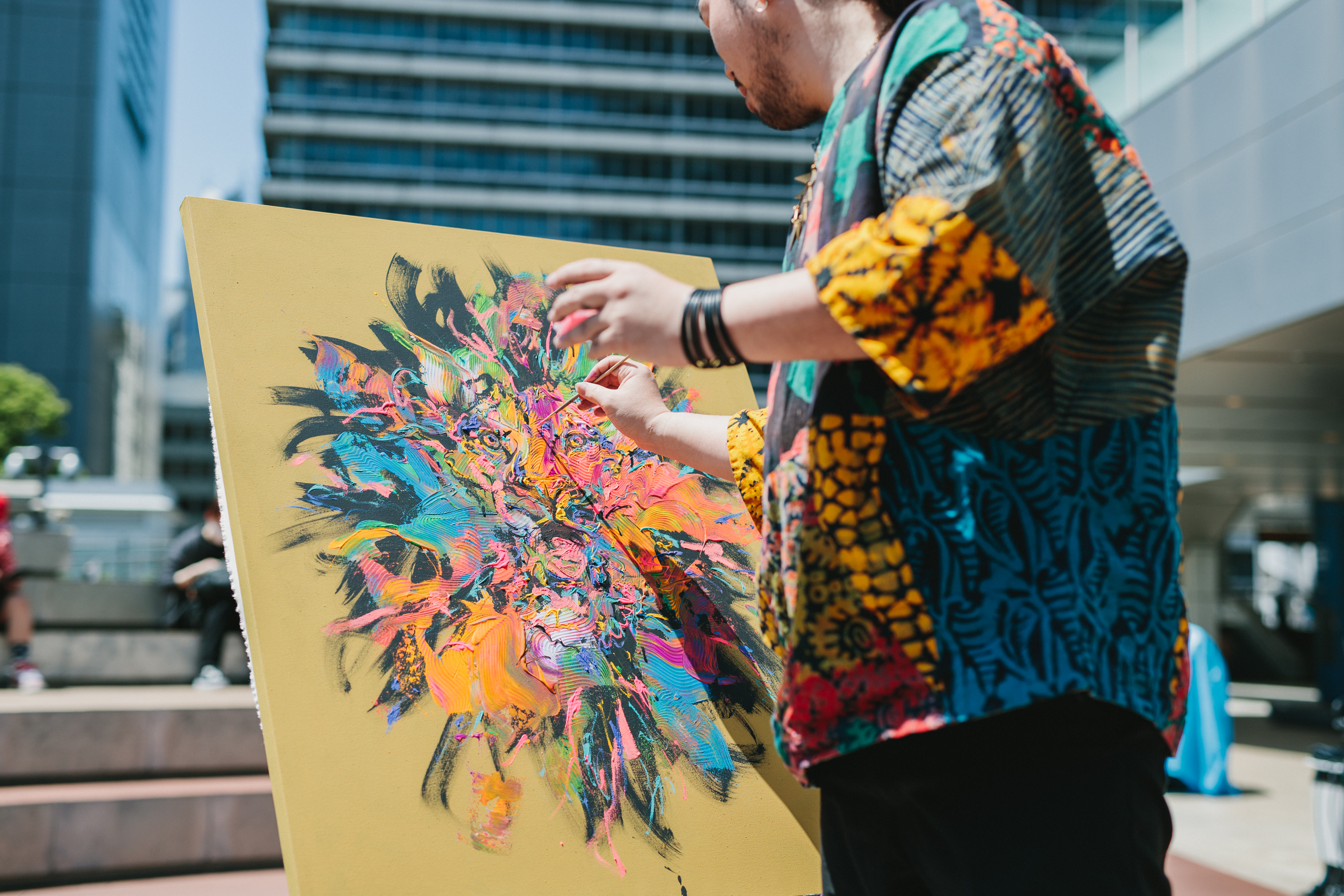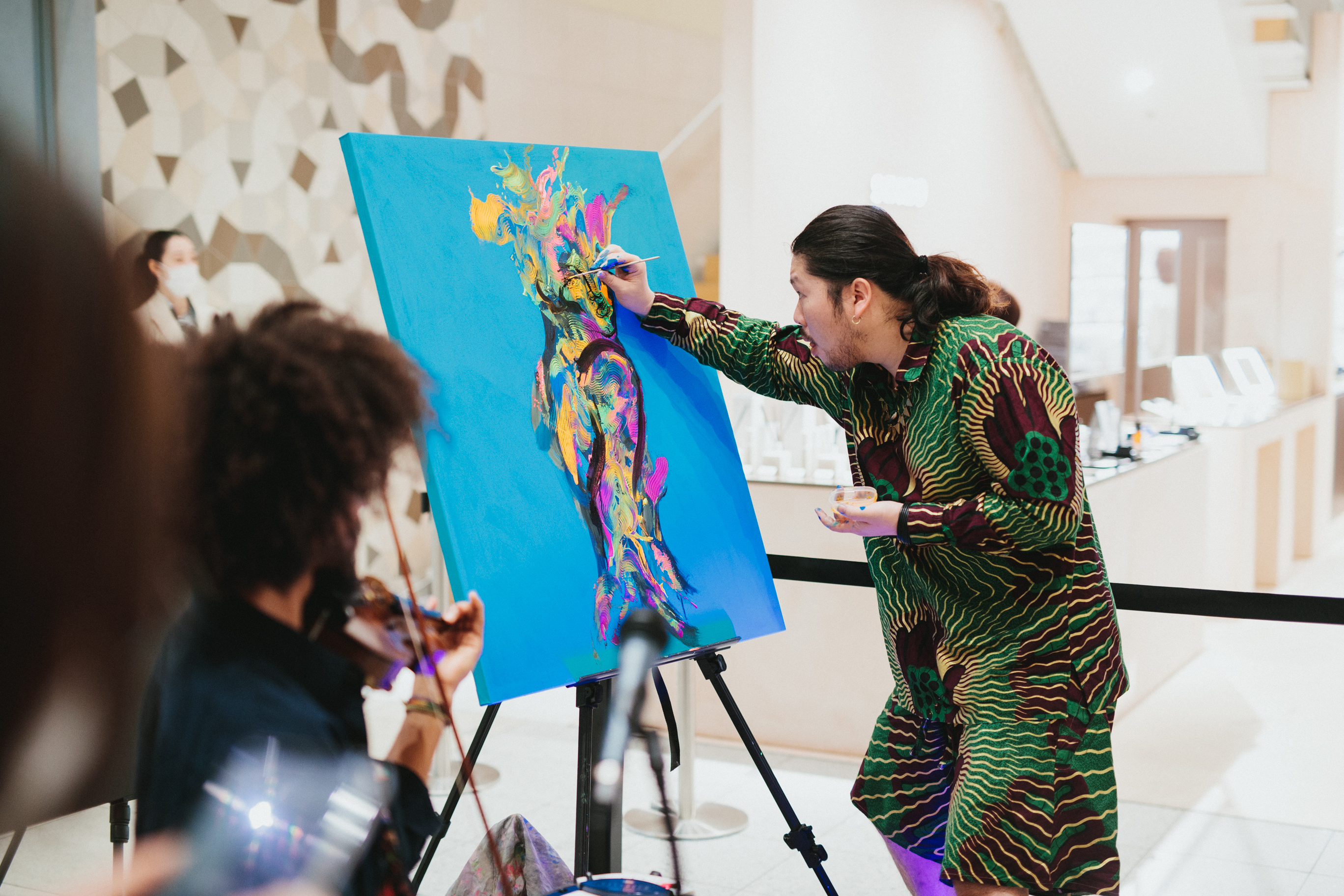 大きなキャンバスに即興でアートペインティング!ペインティング中はBGMとして、Bobby Moses アドリエルさん(バイオリン奏者)に演奏いただき、アート×音楽パフォーマンスを実施しました。