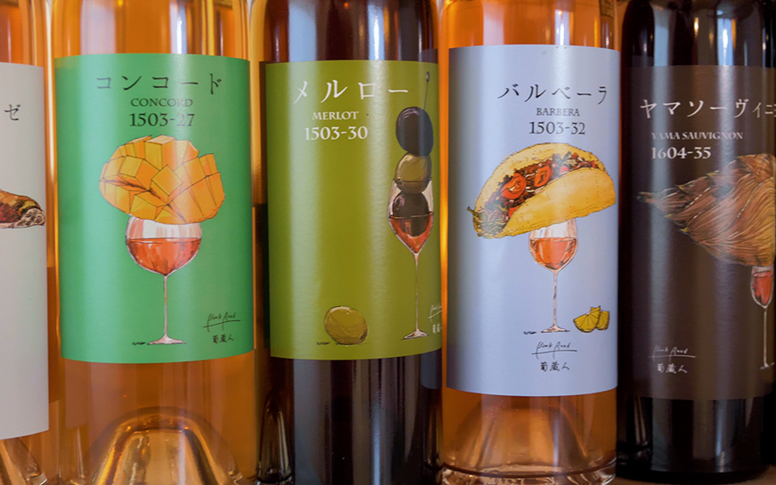 以前あった別のワインでは、バスケットを描いたものもあります。そのワインは、お燗する感じで温めて飲んでみたらすごくおいしかったんです。なので、温度に関係なく飲めるワインとして、バスケットに入れてピクニックに持って行ってもらい、冷やしてもいいし、ちょっとぬるくなってもおいしく飲めますよ、ということを表現しました。