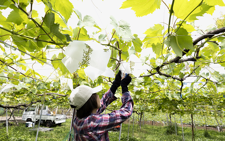 一緒に作業をしようと誘ってくださる農家さんのところには収穫に行きます。先月は、ぶどうに雨が直接あたらないように紙の傘をつける「傘かけ」を手伝ってきました。傘かけも、もちろん収穫も、ひと房ずつの作業です。BookRoadに届くぶどうだけでも年間数トンにもなるので、ほかにも納めているという話を聞くと……農家さんの仕事って本当に果てしないですよね。