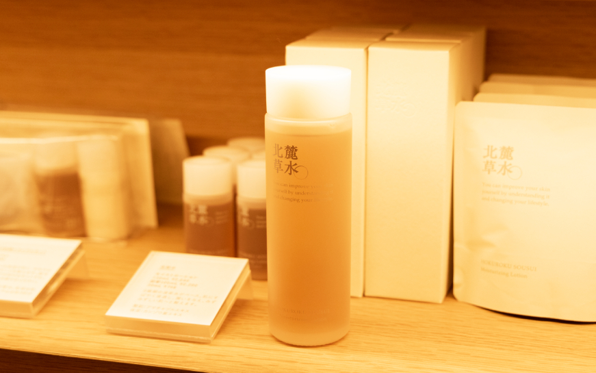 「北麓草水」の直営店に足を運んでみると、ちょっと意外なものが並んでいることに気づくだろう。店内を見渡すと、ローションやせっけんといった一般的なスキンケアやヘアケア、ボディケア用のアイテムだけでなく、アロマスプレーやタオル、野草茶、ジャムなど、生活雑貨や食品が目立つ。北麓草水 ルミネ新宿店の店長、山口友香さんはその理由をこう説明してくれた。