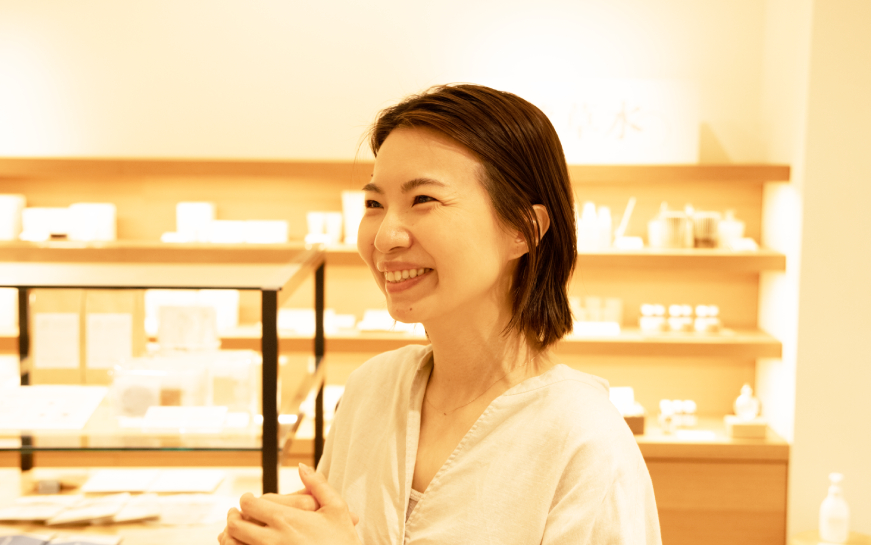 「北麓草水 ルミネ新宿店」の店長、山口友香さん。普段から積極的にスタッフミーティングを開き、顧客とのやりとりで気づいたことや自社製品を実際に使ってみて感じたことなど、意見交換を行っているそう