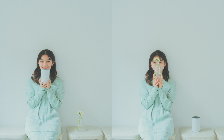 「今回はデジタルデバイスを擬似的に表現できたら楽しい絵になるかなと思いました。スマートスピーカーは花瓶にささった花のよう。AirPodsは花の耳飾りみたいに。相入れないように思える二つの境目がグレーになっていくようなイメージで撮影しました。」と、今回の写真を撮影したフォトグラファーの川原崎宣喜さんは話します。