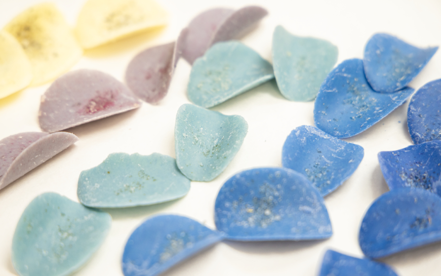 スピルリナなど自然由来の色素を用いたカラフルなペタル(花びら)。ホワイトチョコレートをベースに、ミントやラベンダー、レモンなど、さまざまな風味が香る