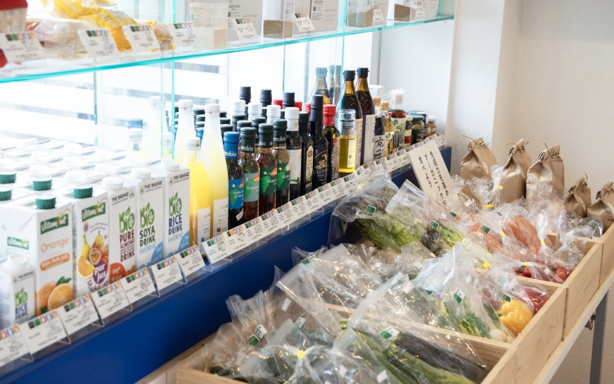 福岡の本店では小代さんおすすめの安心・安全な調味料や飲料、乾物などのほか、オーガニックの野菜やフルーツも販売。一部はオンラインショップでも購入できる
