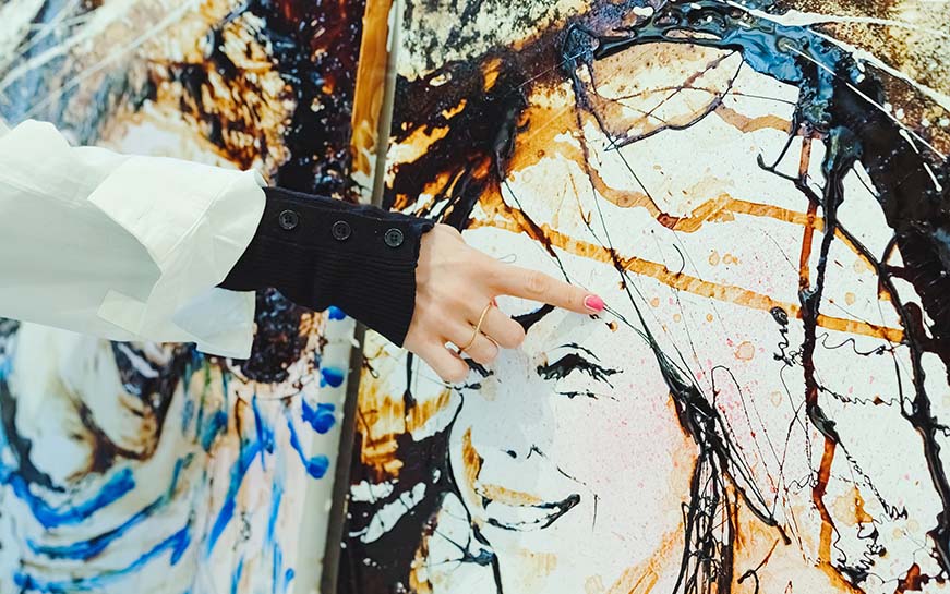 「普段は絵具を使うことがあまり多くないのですが、今回はコーヒーのまろやかであたたかな色合いとの対比を楽しんでもらえたら」と蕨迫さん。この日はバレンタイン直前だったこともあり、「LOVE」をテーマとした作品を発表しました。当日、作品の素材の一部として用いられたコーヒーかすは、ニュウマン新宿内の「ブルーボトルコーヒー」や「ヴァーヴ コーヒー ロースターズ」などのコーヒー専門店から出たものです。アートを通じてサステナブルへと思いをはせる作品が完成しました。