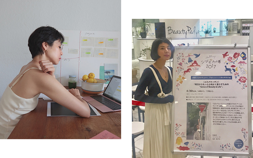 左:執筆中の福本さん 右:コスメキッチンのPRとして活動する福本さん