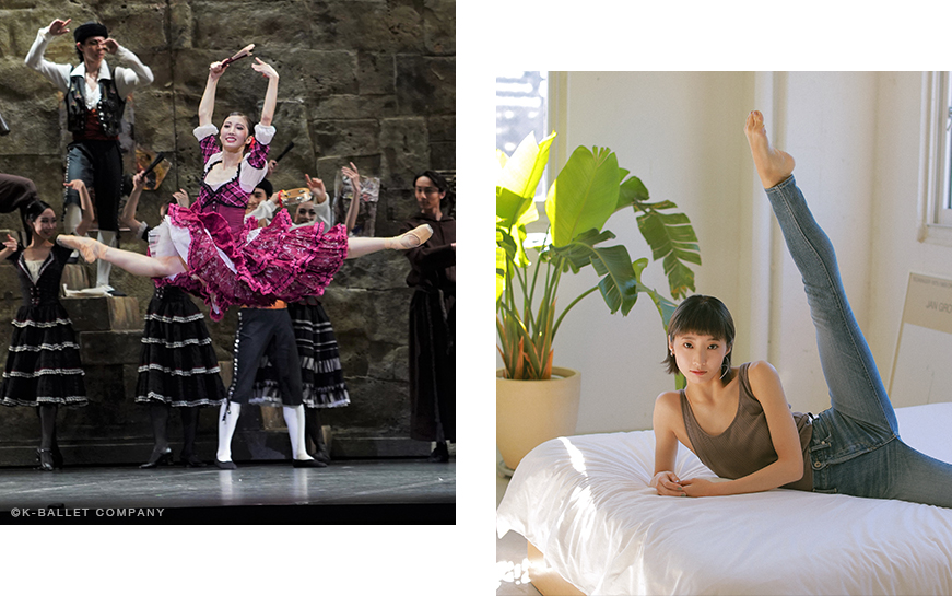 左:バレエダンサーとして舞台上で活躍する飯島さん 右:モデルとして撮影中の飯島さん