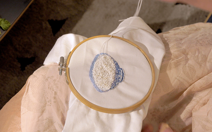今は、子供番組用のごはんをモチーフにした刺繍を制作しています。おいしさが伝わるような立体感を創出し、見るだけでも楽しくなれるような刺繍にできたらと思っています。