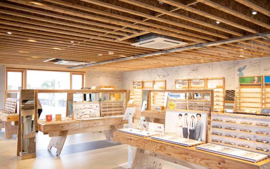 一方、同じく前橋市に今年誕生した「JINS前橋小島田店」は、サステナビリティ推進を体現した新店舗。木造建築の屋上にJINS初となる太陽光パネルを設置し、店舗で使用する電力の約70%を太陽光発電で供給することを目指している。