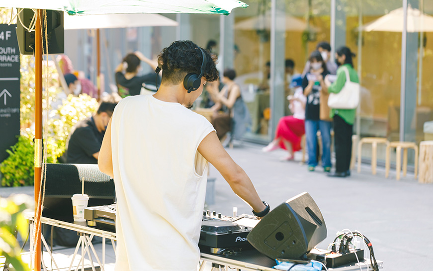 そしてもう一つ、チルタイムに欠かせないのが音楽です。野外イベントの2日間には、今注目のDJ、Eita GodoさんとDJ RINAさんが「チルなミュージック」をテーマに、4階ガーデンで DJプレイを披露しました。お気に入りのドリンクを片手にDJのセレクトする心地よい音楽に包まれる時間は、まさに上質なひととき。ガーデンでプレイする音楽は館内にも流れ、ニュウマン全体が特別な2日間となりました。