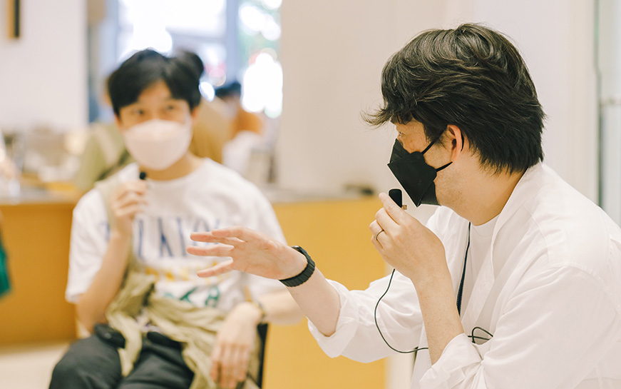 お互いの創作のスタイルについて語り合う、五⽉⼥哲平さん(右)と蓮沼執太さん(左)