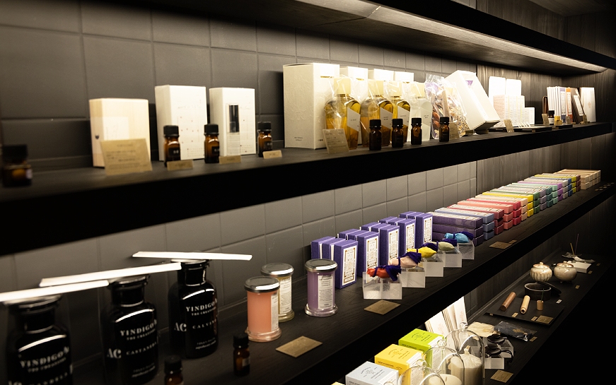 今年4月には京都寺町二条に寺町店をオープン。モダンなムードの店内に、寺町店限定の線香をはじめ、バスソルトやポプリ、キャンドルなども並ぶ。2階にはワークショップなどを行うスペースもある