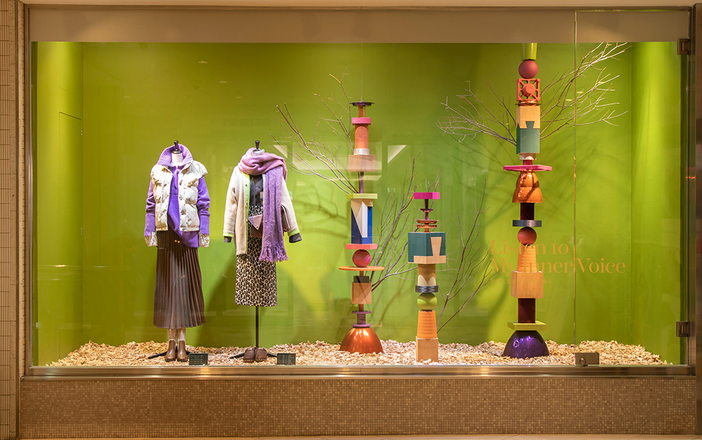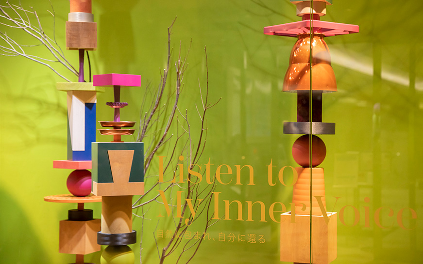 まさに心の声に耳を傾けて捉えたテーマを具現化したウィンドウでは、多様な姿をした木々のオブジェが立ち並び、自然に包み込まれるような空間が演出されています。