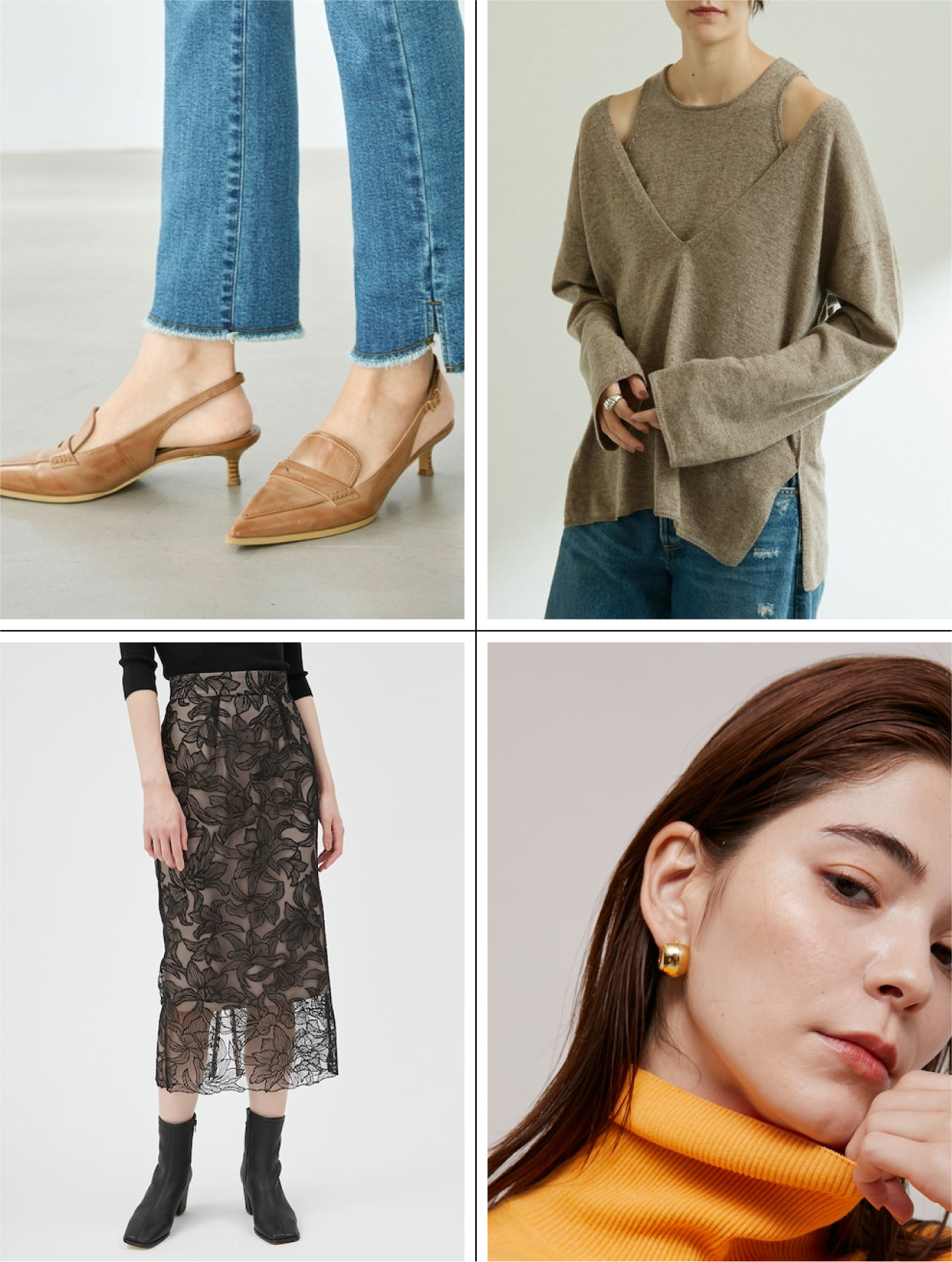 優秀シルエットのニットにレースのスカートを合わせたら、秋ならではの異素材ミックスコーデが完成。