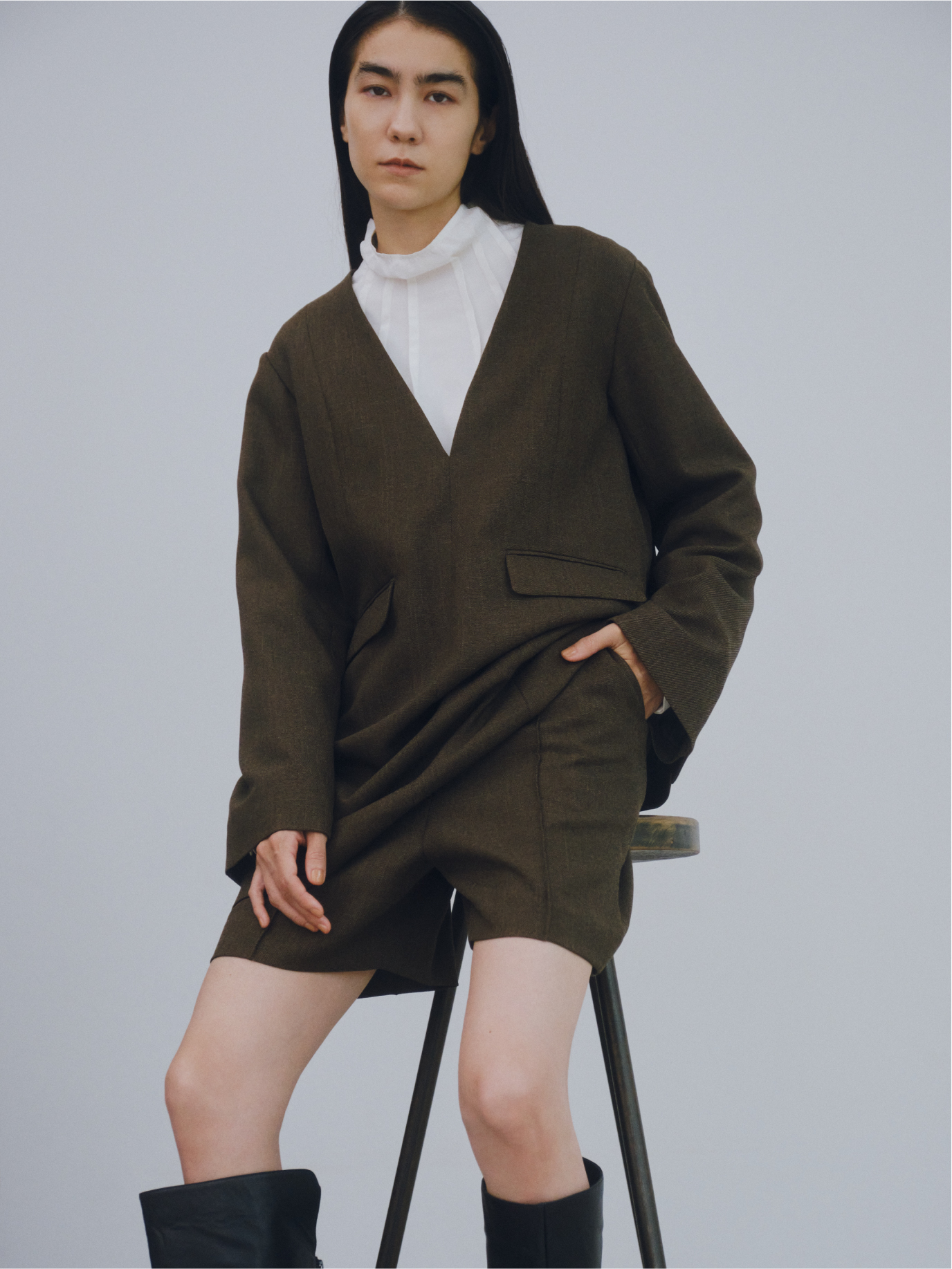 セットアップで着こなせるツイードのジャケット風ワンピースとハーフパンツ。