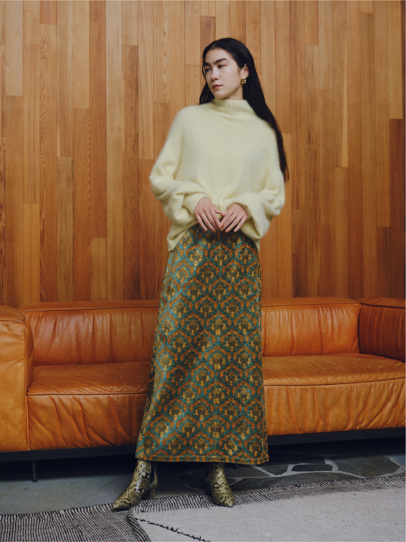 主役は重厚感のあるカーテン柄のパイルジャカードのタイトスカート。