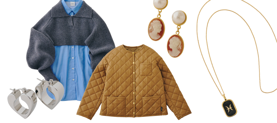 カメオ×パールのピアスに、イニシャルネックレス、シグネット調リングなど、高級感のある一点をさりげなくプラス。キルティングの質感が上品な〈TraditionalWeatherwear〉別注のジャケットと合わせてクラシカルに。