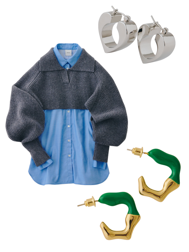 襟元に映えるアクセサリーとして、シャープな印象を与えるフープピアスを選んでみて。
