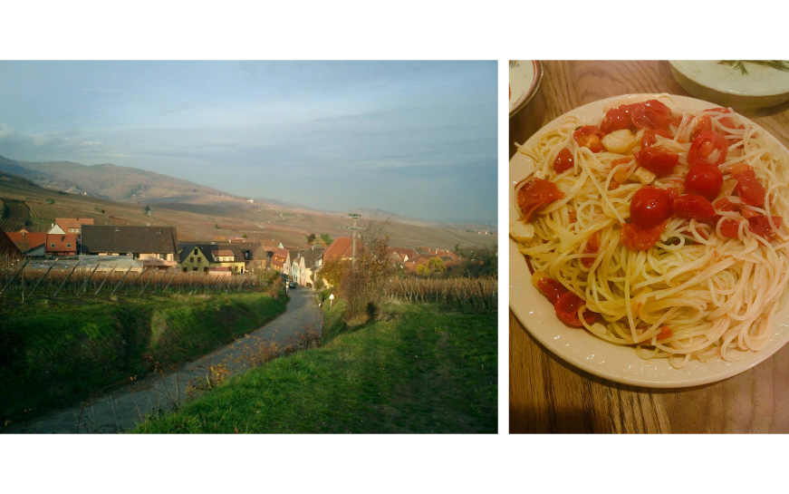 山口さんが過ごした海外の風景(左)と、自宅で友人たちと囲む料理(右)