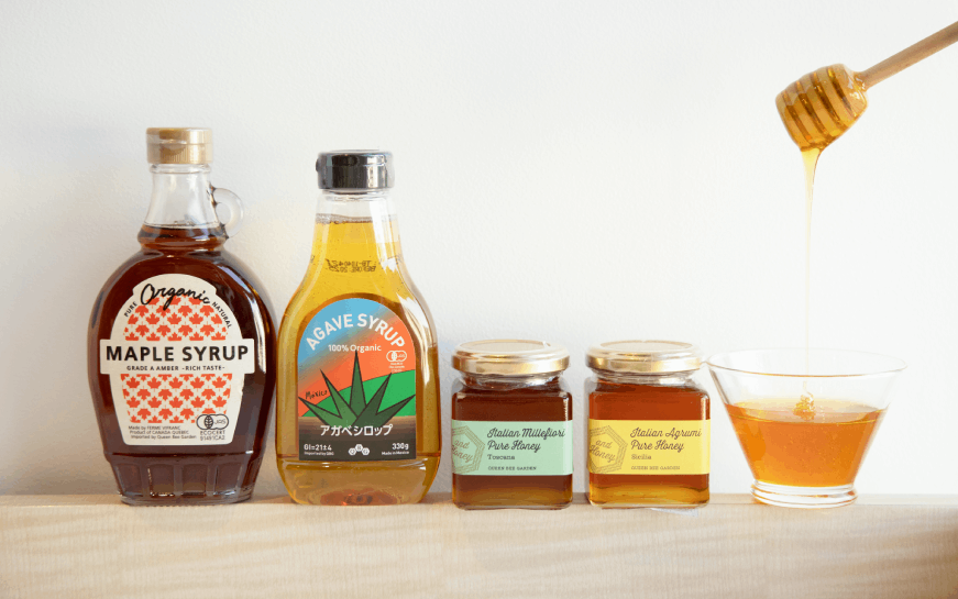 Lady Bearが扱う天然甘味料。左から「オーガニック メープルシロップ Grade A アンバー」「100%有機アガベシロップ」「イタリア産ミルフィオーレはちみつ」「イタリア産シトラスはちみつ」