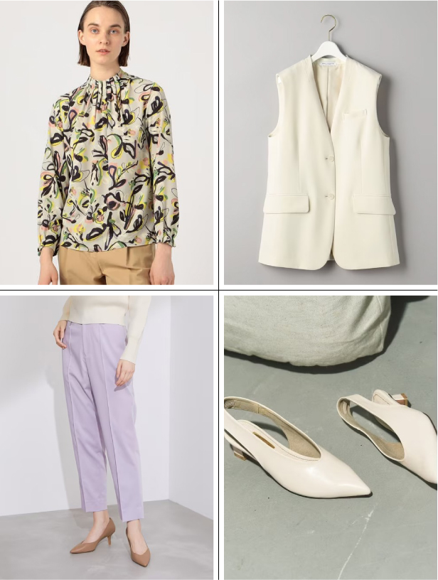 ホワイトのベストと柔らかなソルベカラーのボトムスを合わせて、個性的なトップスを大人ぽくまとめて。