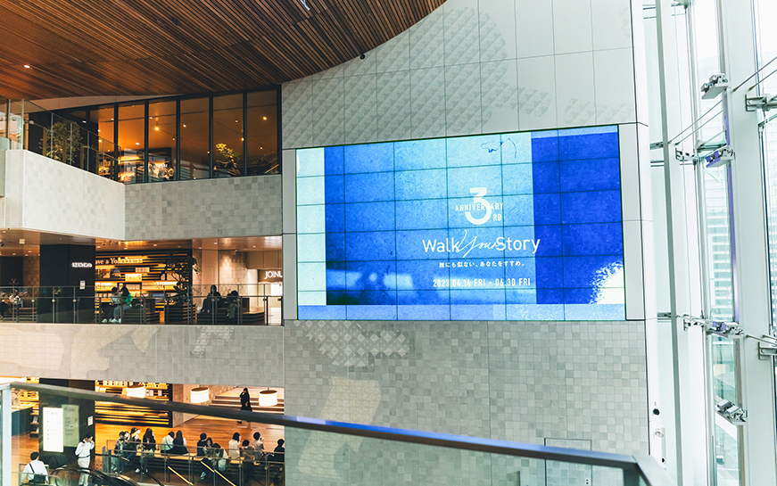 館内の大型ビジョンでも、ブルーが印象的なビジュアルを展開。