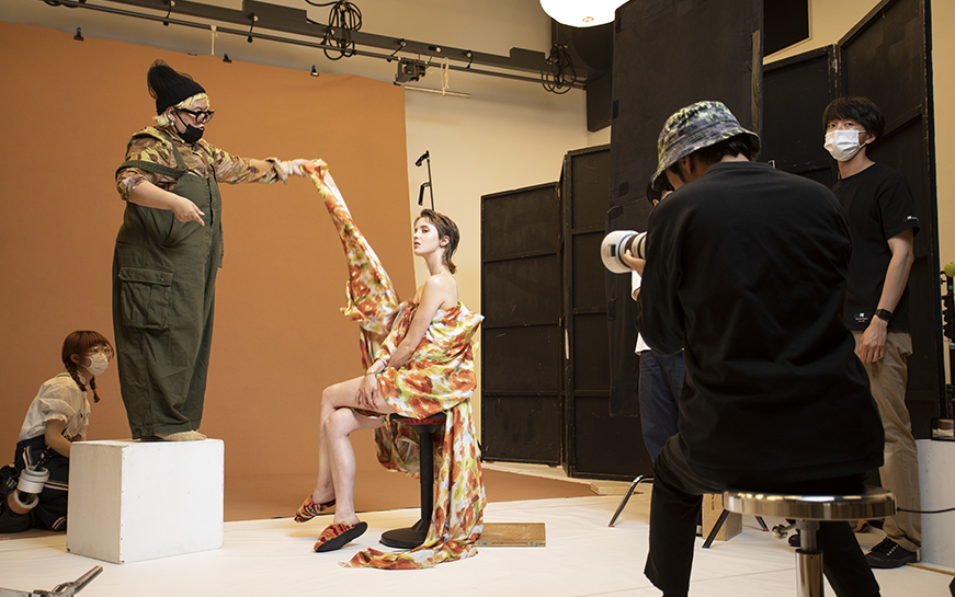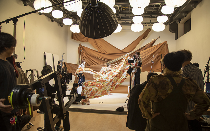 撮影では、布にブロワーで風を当てつつ、数人のスタッフが布を持って動きをつけていきました。「布の動きは偶発的なところも多く、リリーさんの動きとワンショットで決まるタイミングを探るのが大変でした」と柴田さん。石本さんは「トライを重ねながら、だんだんクオリティを高めていきました。みんなが一体となって、撮るたびに盛り上がっていきましたね」と話します。