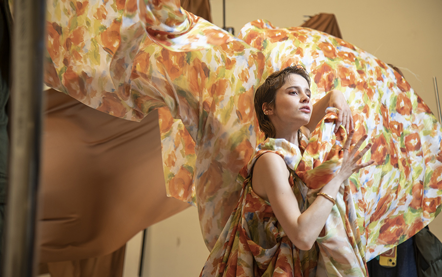 つぎの季節やファッションへの期待感を体現するものとして取り入れられているのが、モデルのリリーさんがまとっているテキスタイルです。アートディレクターの柴田ハルさんは、「着るものによって気持ちが変わったり、新しい予定が生まれたり、自分の世界がどんどん広がっていく可能性みたいなものを、“服になる前の布“やその広がりで伝えていきたいと思いました」と語ります。