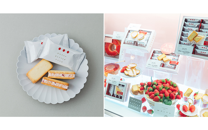 なかでも注目したいのは「あまおうバターサンド」です。あまおう苺パウダーとコーンフレーク、ラズベリーのフリーズドライが入ったホイップチョコを、芳醇なバターの香るクッキーでサンド。苺とバターの濃厚な香りとザクザクした食感があとを引き、ついつい手が伸びてしまいます。