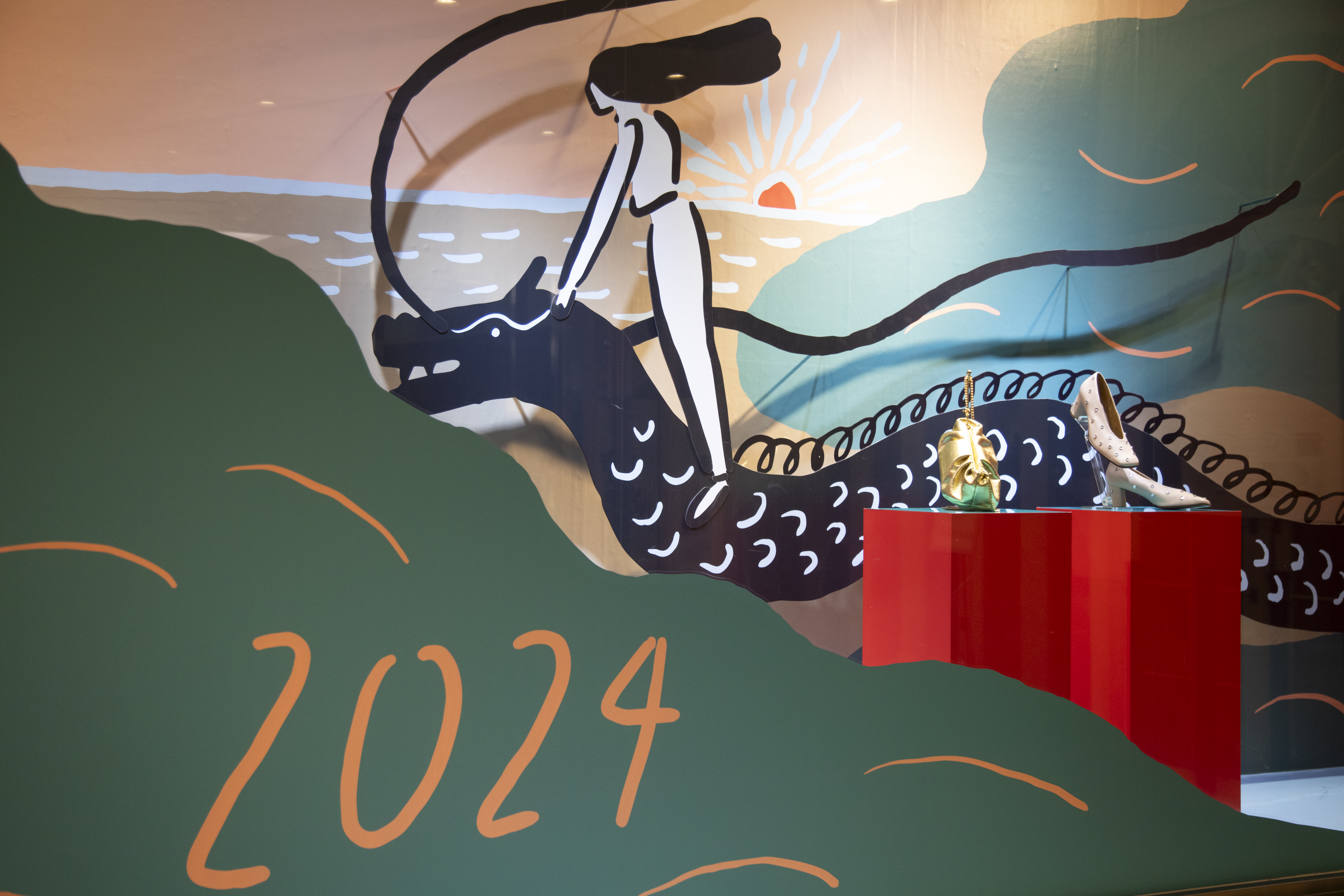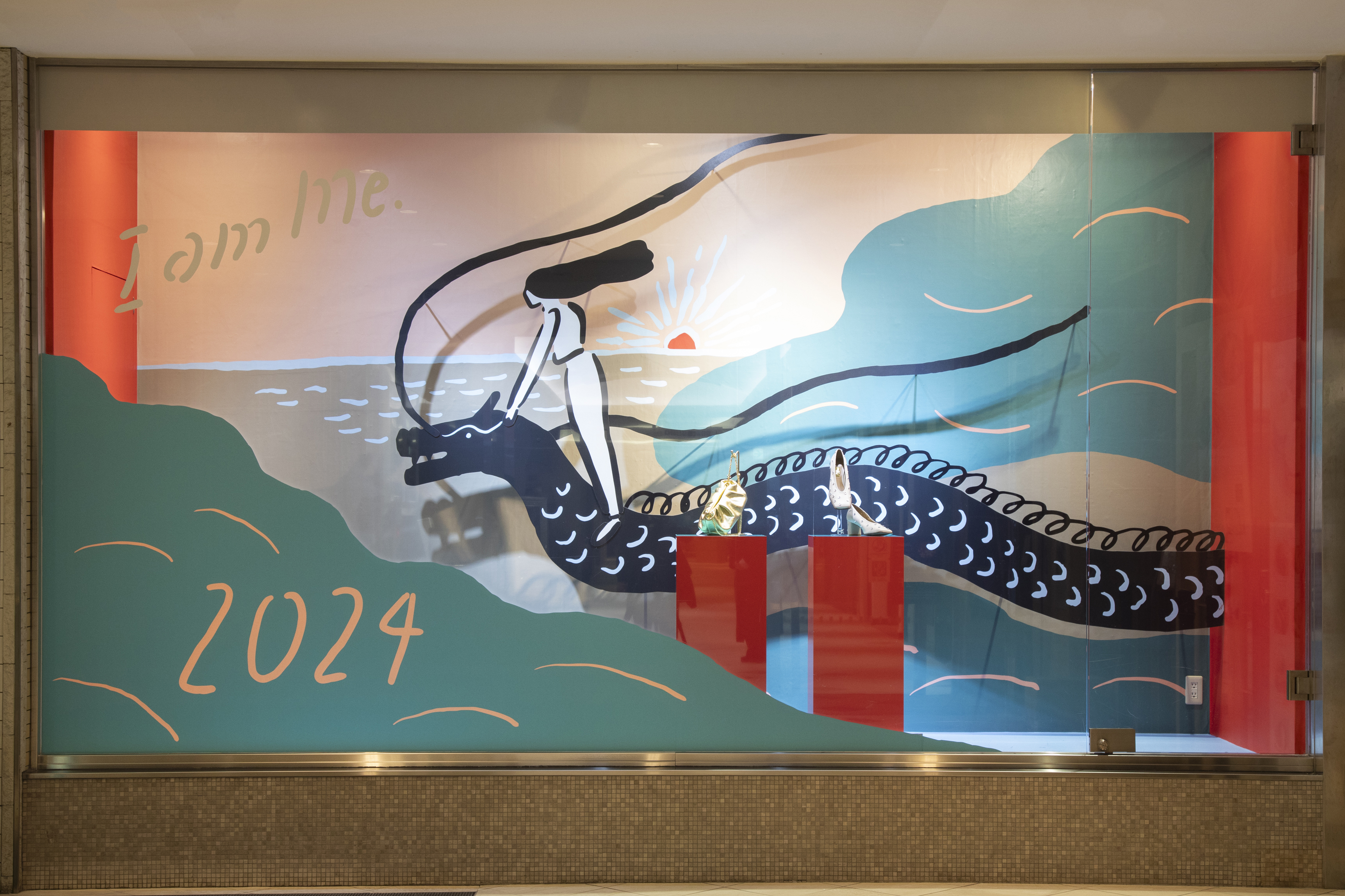 新年らしい華やかな配色のウィンドウには、龍にまたがり、大海原を背に力強く進む女性の姿。髪をなびかせ前を見据える彼女は、まさに自分を信じて前進し続けるわたしたちの姿です。そして、どことなくチャーミングな印象の龍には、マサキさんのこだわりが詰まっていました。