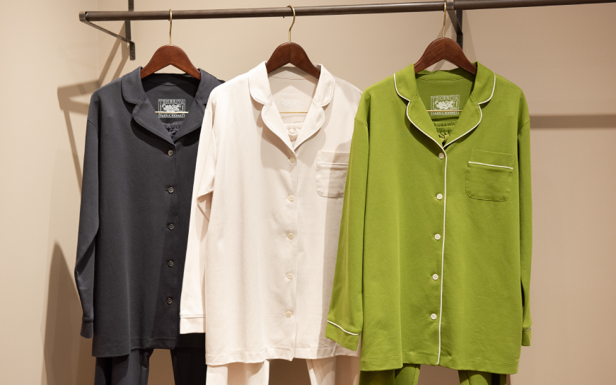 タオルのほか、ルームウェアやバスローブ、ベッドリネン、ベビー用品なども人気。こちらは秋冬用のパジャマ