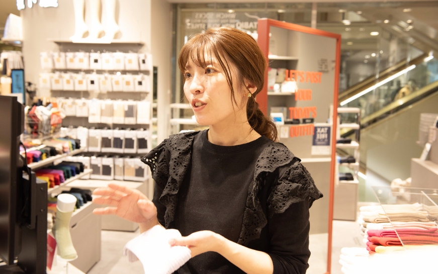タビオ株式会社で営業を担当する佐野智美さん。靴下から始めるコーディネートが好きだったことから同社へ。「最近は推しのメンカラ(アイドルグループなどのメンバーカラー)の靴下を購入する方も増えています」