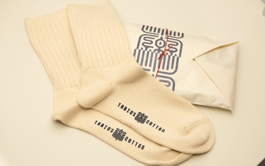 奈良県の休耕田を活用し育てた綿花から生まれた「TABIO’S COTTON」の靴下。ロゴは東京2020オリンピック・パラリンピックの大会エンブレムも手がけた美術家の野老朝雄(ところあさお)氏がデザイン