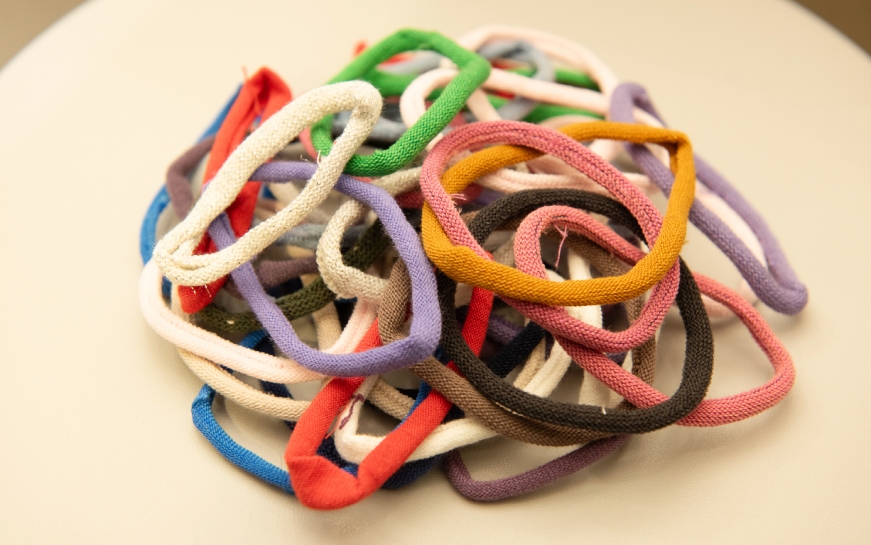 靴下の製造工程で生じる輪っか状の端切れ、通称「端切れ輪っか」。かつては産業廃棄物として廃棄されていたが、現在はSDGsを学ぶワークショップや障害者のリハビリなどに活用されている